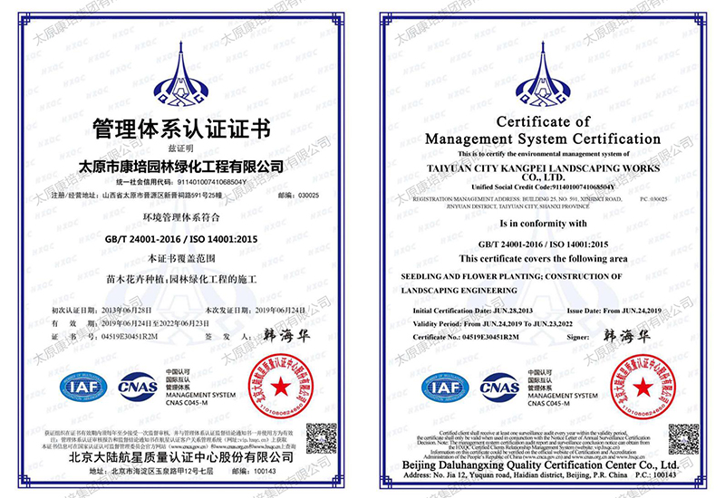 公司現(xiàn)有施工機械2000余臺,在太原、忻州、晉中、運城等7個地市有苗木基地,擁有從花卉苗木培育到園林景觀綠化測繪施工再到養(yǎng)管維護的園林景觀綠化和生態(tài)環(huán)境修復(fù)全產(chǎn)業(yè)鏈,完成和參與了包括省、市重點工程在內(nèi)的1000余項園林景觀綠化、道路綠化、城市改造、市政工程和生態(tài)環(huán)境綜合治理工程,施工足跡遍布全省,超百項工程獲得國家、省、市優(yōu)質(zhì)工程表彰,通過了ISO9001質(zhì)量管理體系認證。